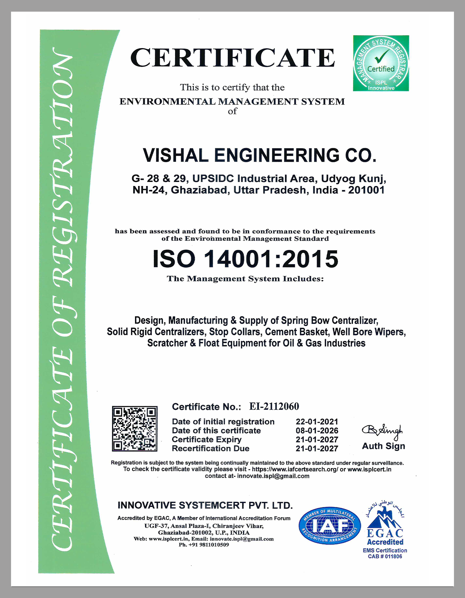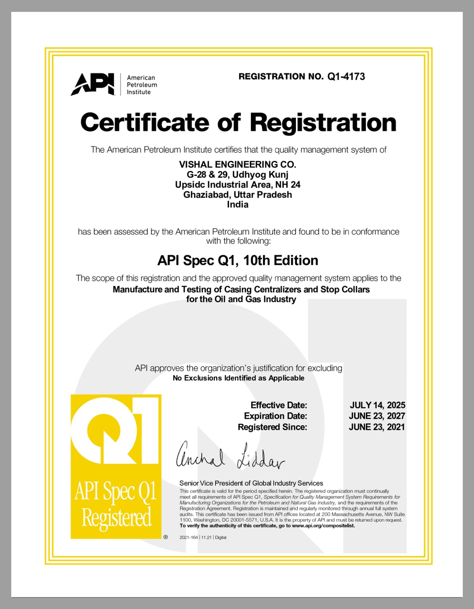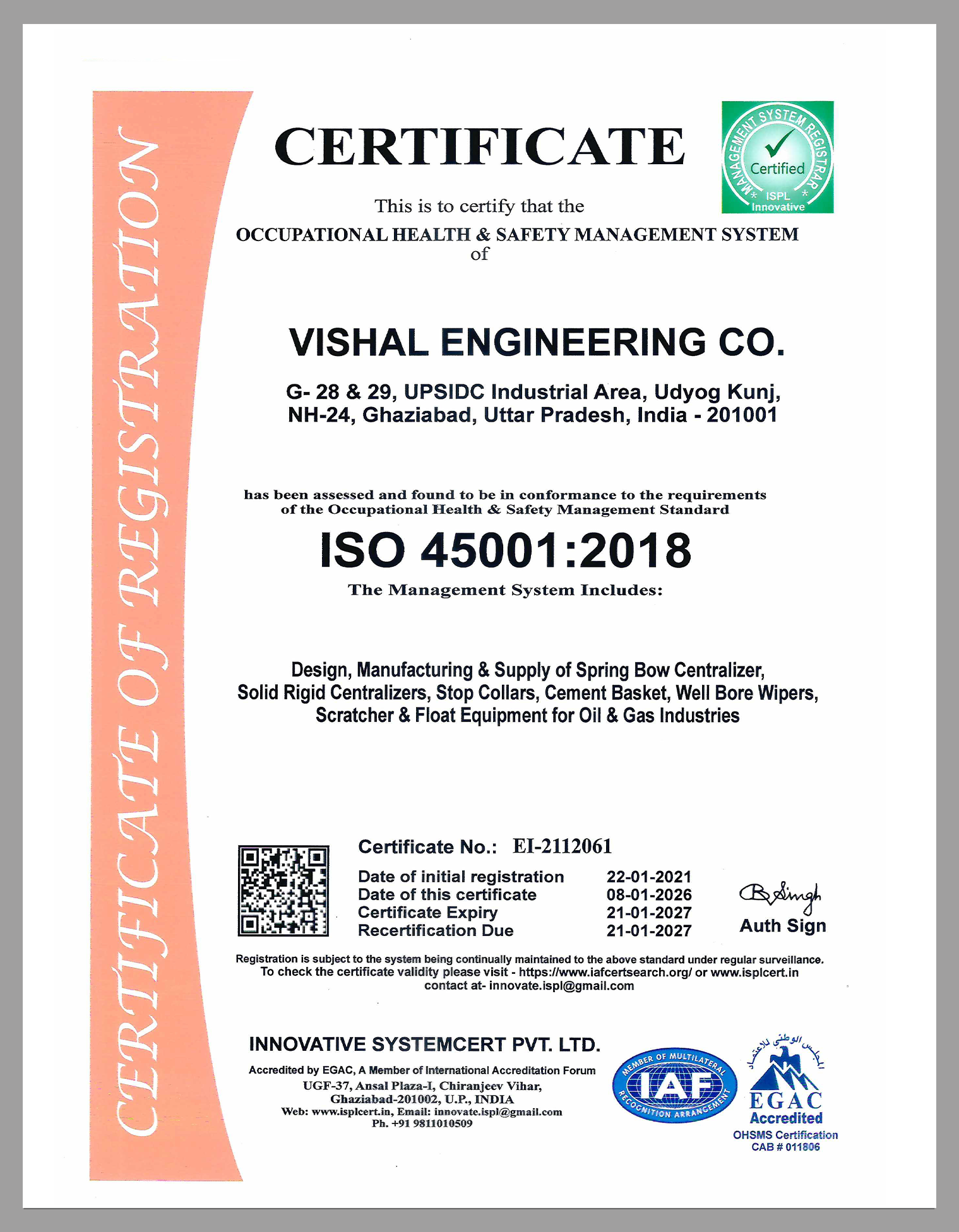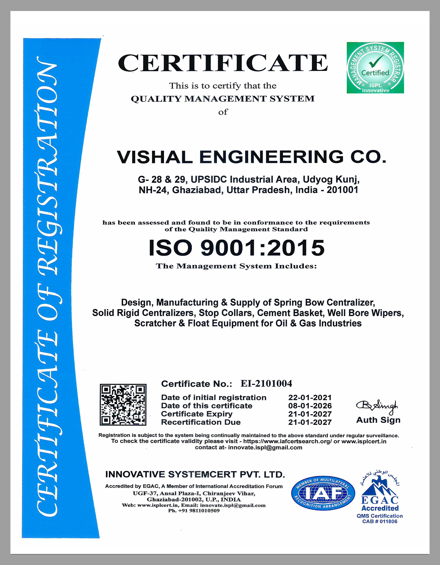 Vishal Engineering Co. is a manufacturer of casing & cementing accessories since 2002 to E&P companies worldwide and conforming to an ISO 9001:2015 and has all the Quality Systems in place for design, planning, manufacturing and quality monitoring & traceability to ensure that our company products match the highest quality standards.